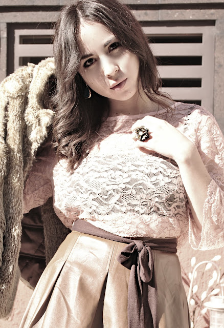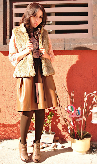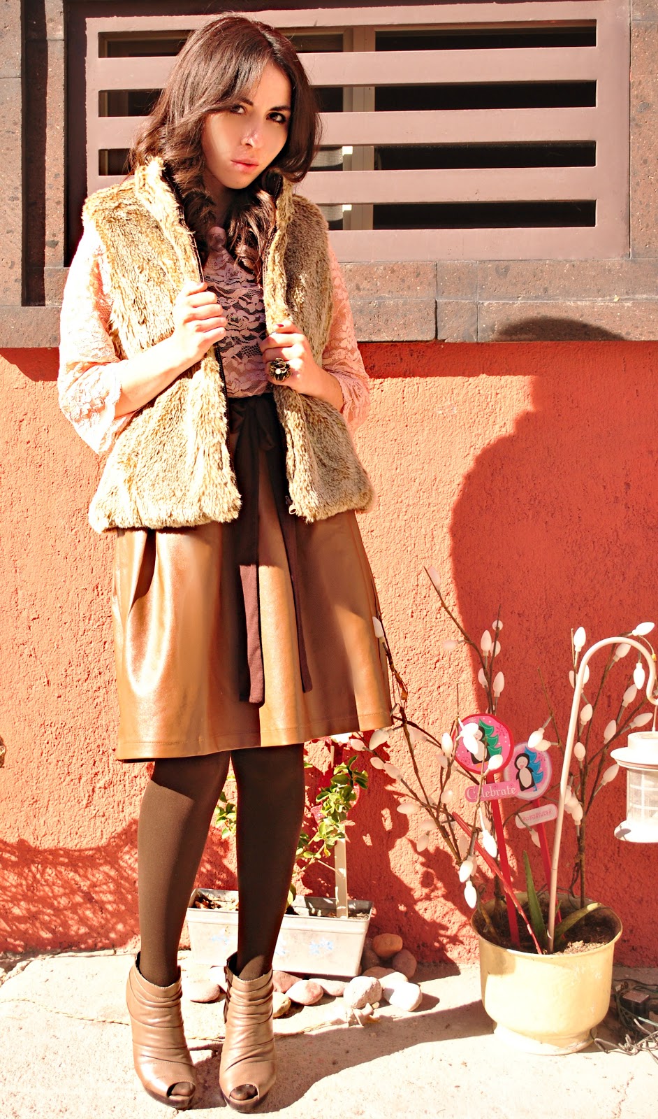 Que lindo look! Me encantó la falda tipo piel combinada con el encaje de la blusa.